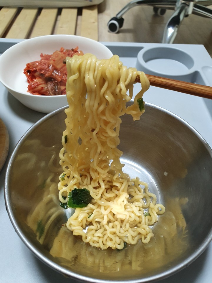 한국인의 라면에는 역시 김치죠 ? 맛있게 잘 익은 김치와 별도로 넣은 파와 함께 한젓가락 들어봅니다.